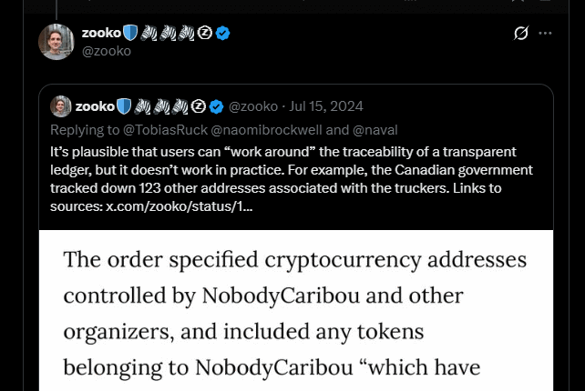 Zcash co-founder Zooko Wilcox also commented on the thread, highlighting the fact that the Canadian government had managed to track down Bitcoin addresses linked to striking truckers due to the transparent nature of Bitcoin’s blockchain.