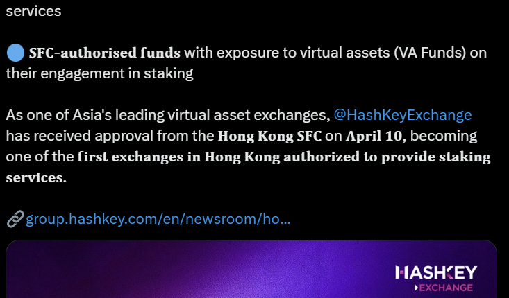 HashKey was granted approval on April 10 after the Hong Kong Securities and Futures Commission (SFC) provided regulatory guidance on staking services to Licensed Virtual Asset Trading Platforms (VATPs) and authorized funds, the company disclosed on social media.