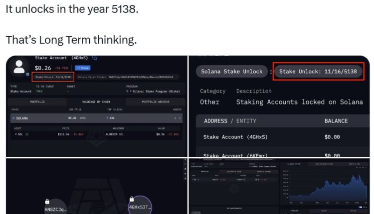 A crypto user has gone very long on Solana, staking a very small portion of the token for the next 3,000 years, according to blockchain analytics firm Arkham Intelligence.
