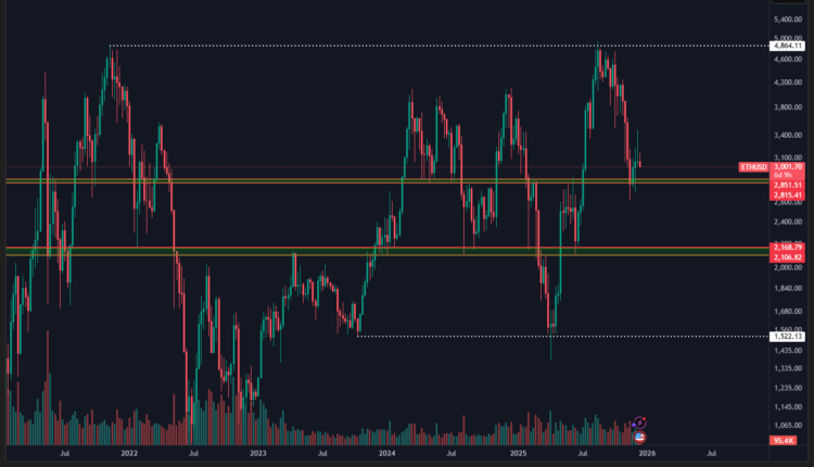 Data from Glassnode showed that the next significant support below $2,800 sits at around $2,100, where approximately 2.1 million ETH were previously acquired.