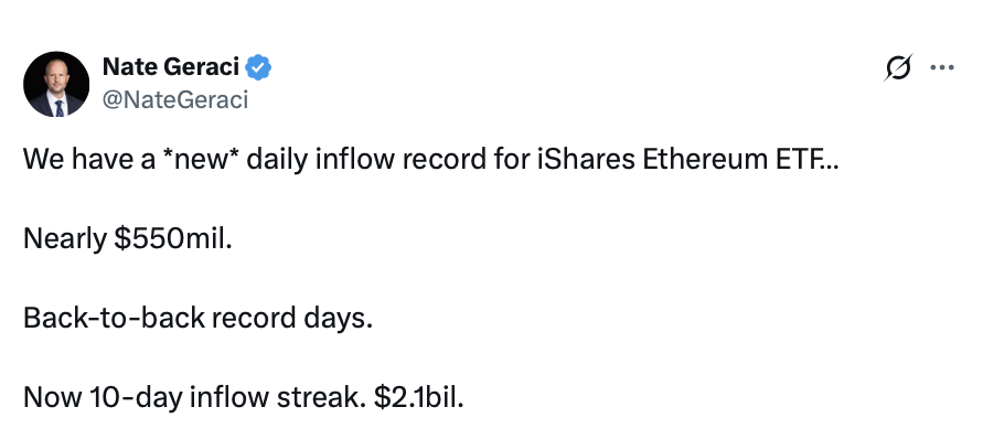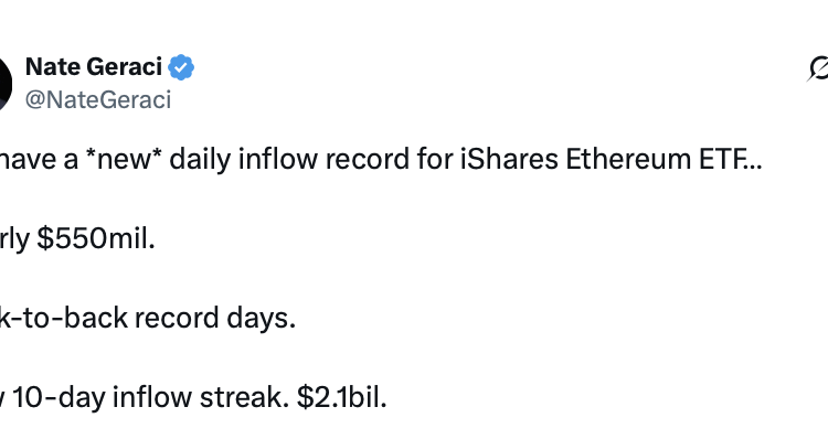 That kind of move is a stretch,” he added, but said the possibility is open as long as strong ETF inflows continue, staking is added to the Ether ETF, investor sentiment shifts to a more risk-on environment, and Ethereum gains wider adoption as a network: