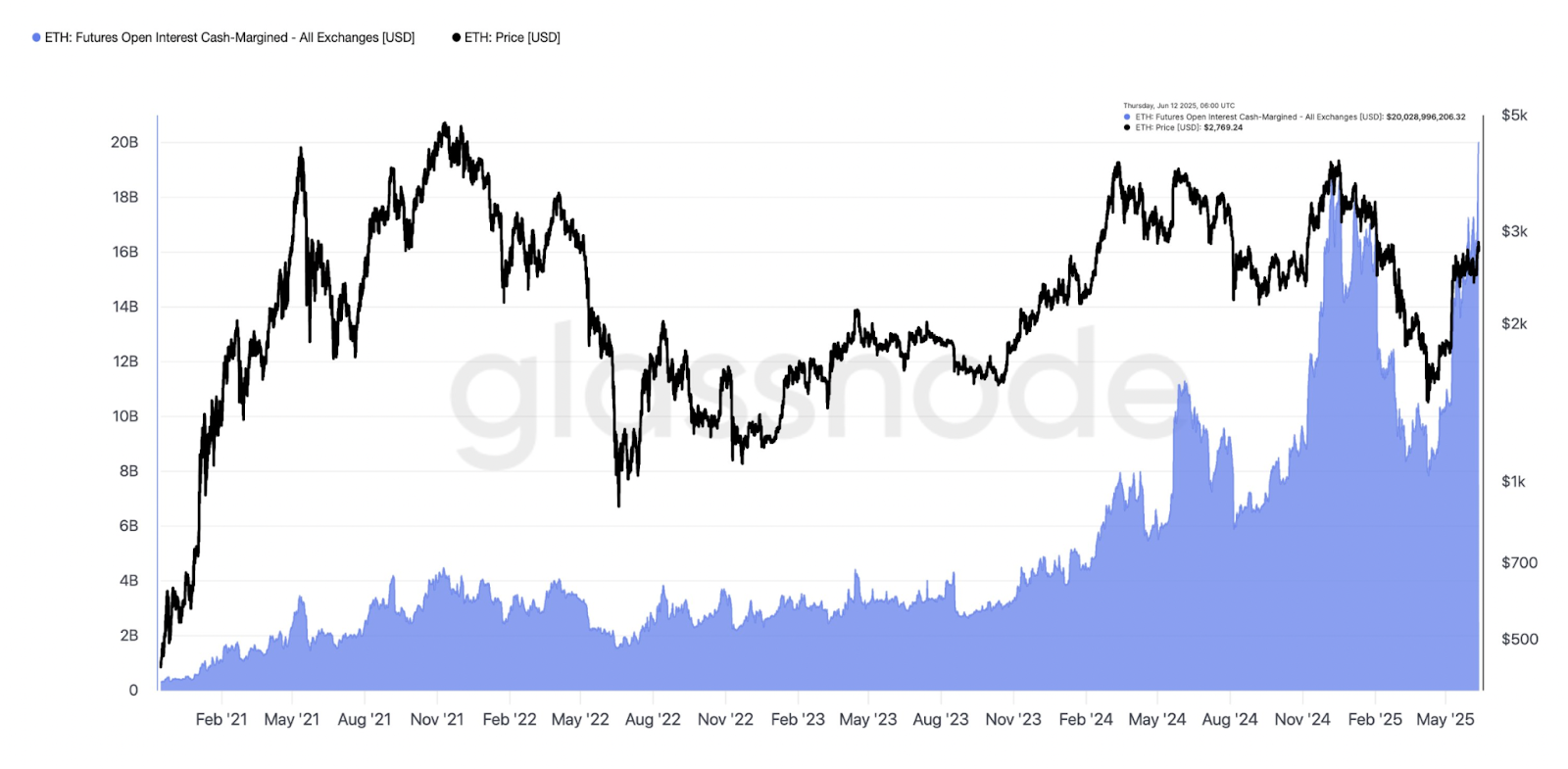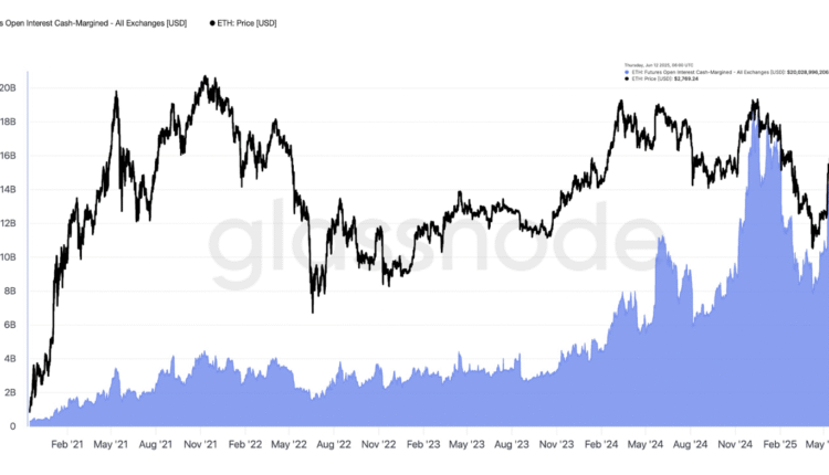 ETH futures open interest (OI) (cash-margined) hit a new all-time high of over $20 billion on June 12, up 155% since April 9, as per data from Glassnode.