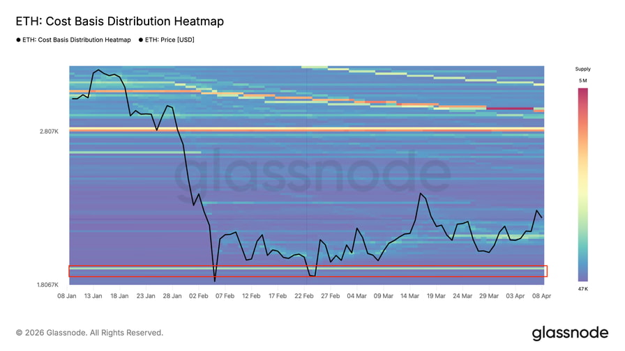 This is the area around $1,800, where investors acquired more than 1.35 million ETH, according to Glassnode’s cost basis distribution heatmap.