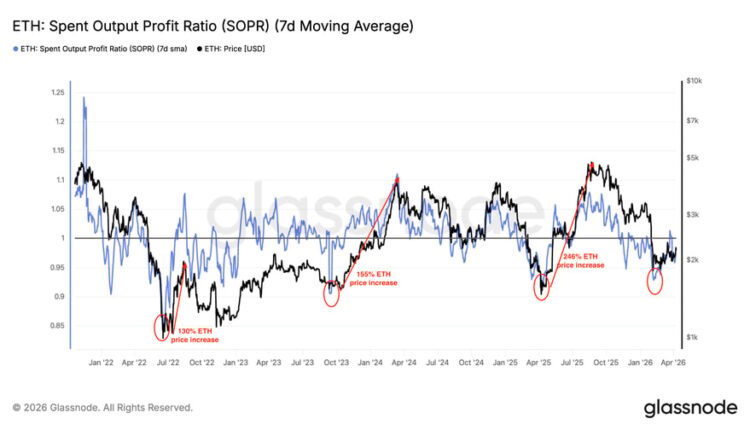 SOPR measures the profit or loss of spent ETH outputs by comparing the value of coins when they were last moved to their value when they are spent again.