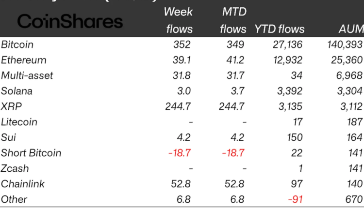 XRP exchange-traded products (ETPs) posted inflows totaling $245 million in the week ending Dec. 5, “bringing year-to-date inflows to US$3.1bn, far eclipsing the US$608m inflows seen in 2024,” CoinShares head of research James Butterfill said in its latest Digital Asset Fund Flows Weekly report, adding: