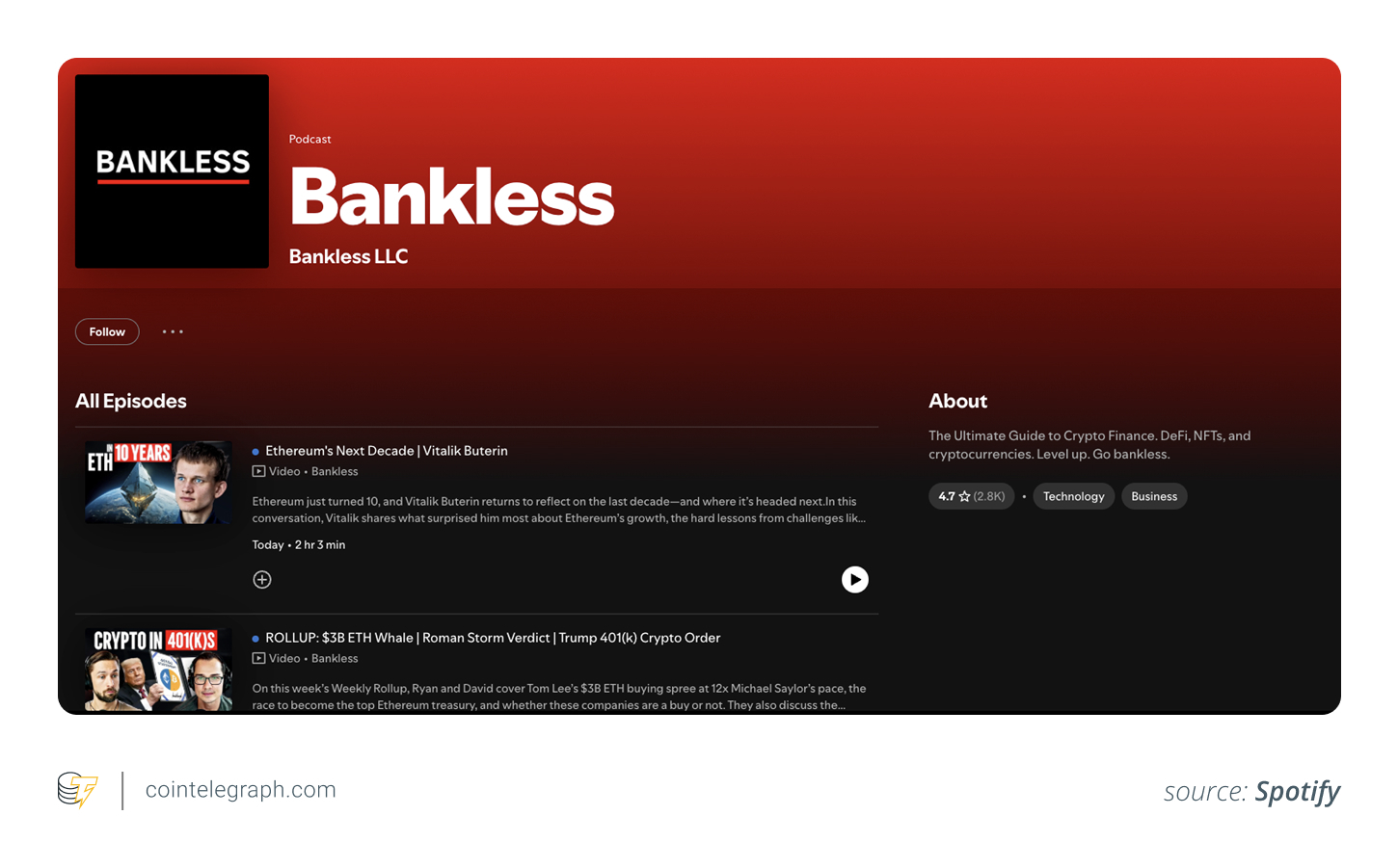 “Bankless,” for example, logs around 2 million podcast downloads each month. With a typical host-read cost per mile (CPM) or cost per thousand downloads of $25-$40, sponsor revenue can grow quickly across multiple channels (podcasts, YouTube and newsletters).