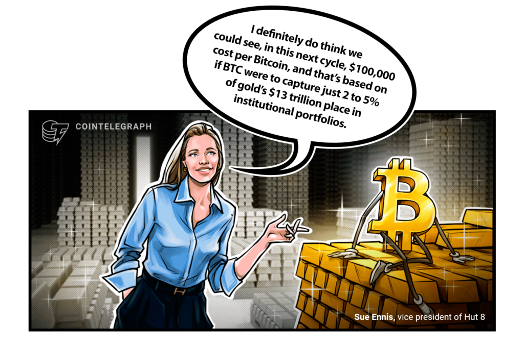 “I definitely do think we could see in this next cycle $100,000 cost per Bitcoin, and that’s based on if BTC were to capture even 2 to 5% of gold’s $13 trillion place in institutional portfolios.”