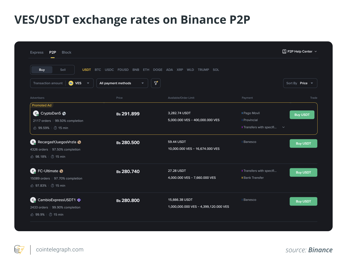 With annual inflation around 229% as of May 2025, everyday prices track three references: the central bank of Venezuela’s (BCV) exchange rate, the parallel “dólar negro” and a Tether USDt (USDT) peer-to-peer (P2P) rate many merchants actually use.