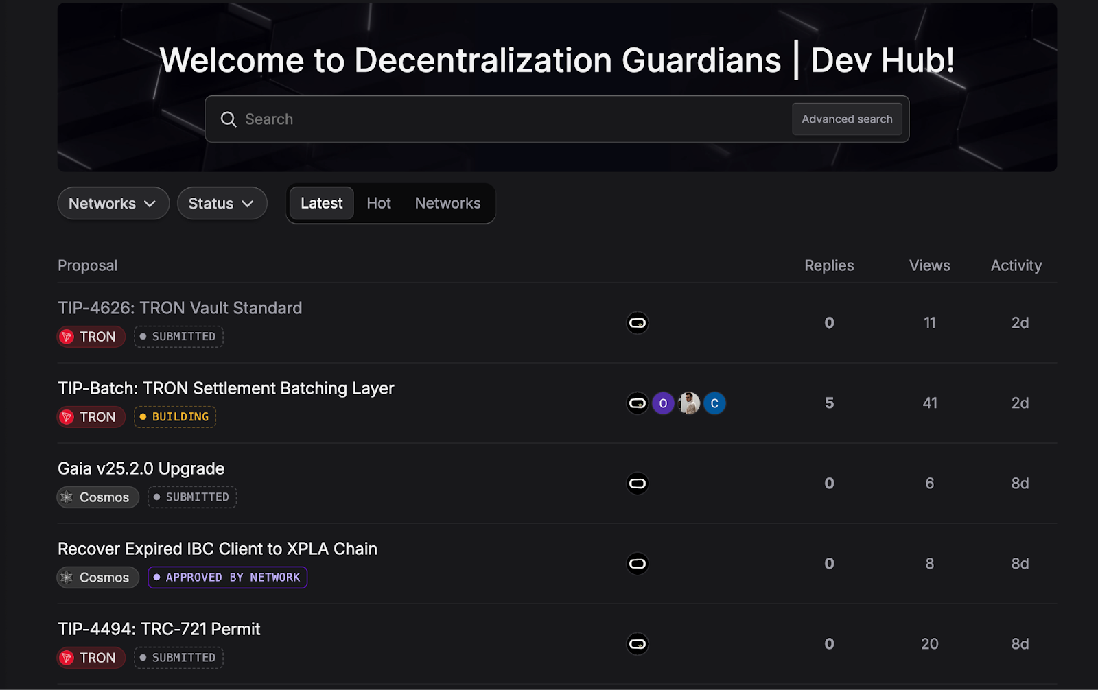 The Proposals section on CTDG Dev Hub lists active and historical items, organized by network, status and topic. Together with CTDG’s validator activity across multiple chains, the platform forms part of a longer-term effort to make decentralized development more observable and collaborative.