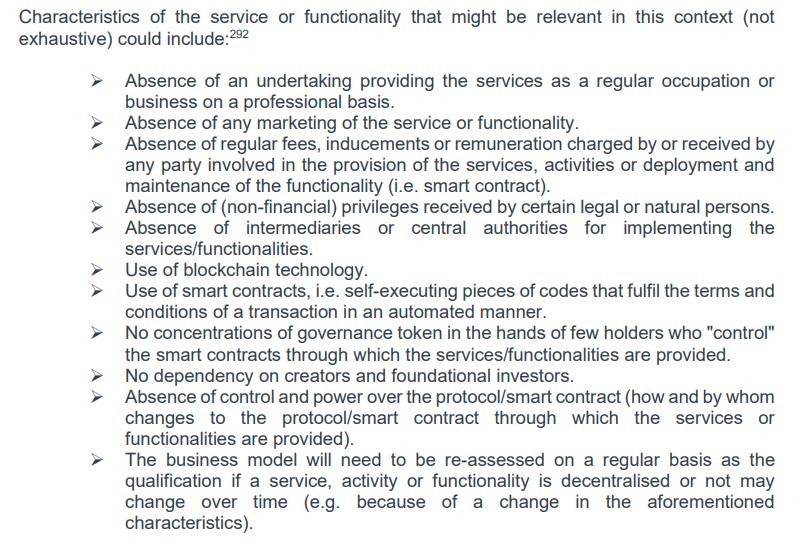 Like smart contracts, determining full decentralization in Europe requires further clarification. The report did attempt to lay out a checklist within the limits of how MiCA and the Markets in Financial Instruments Directive are structured.
