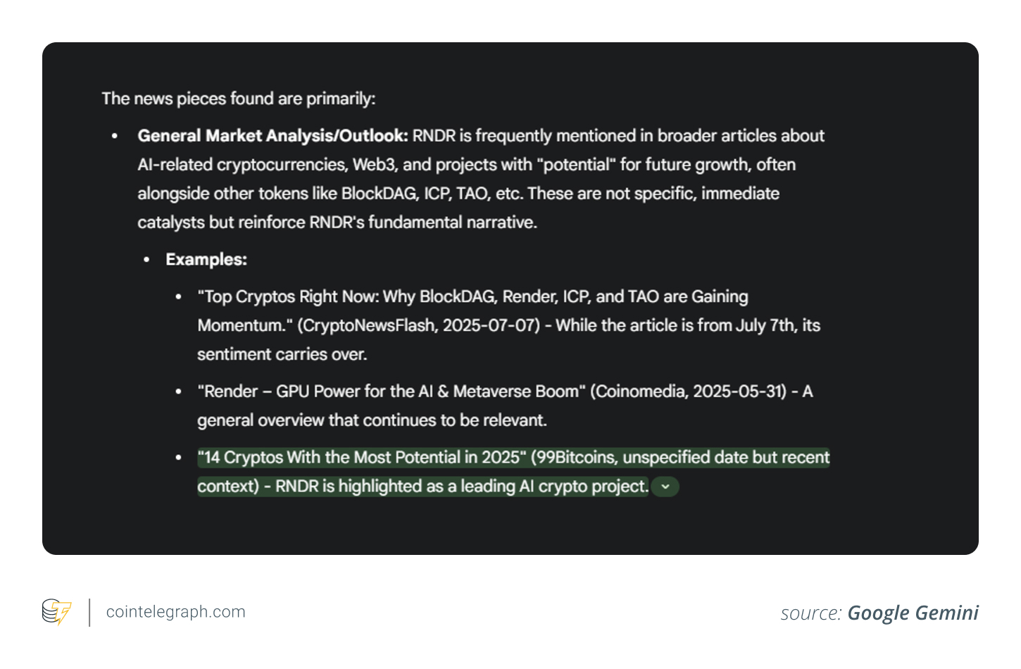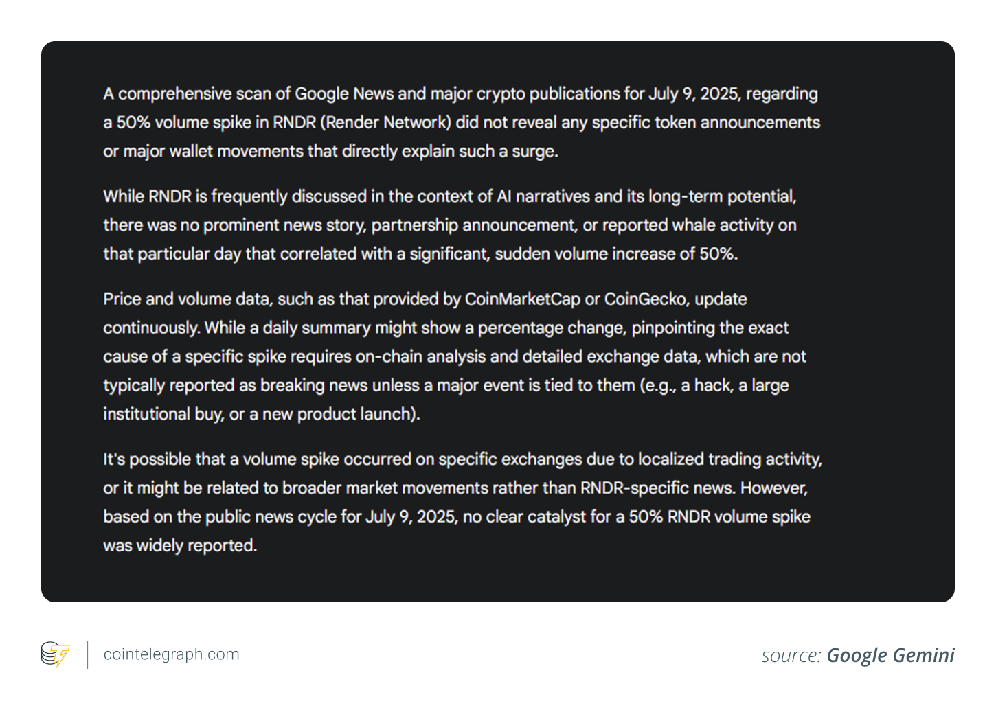 Gemini’s output showed no clear news catalyst for RNDR’s 50% volume spike on July 9, 2025, instead offering contextual analysis tied to long-term AI narratives.