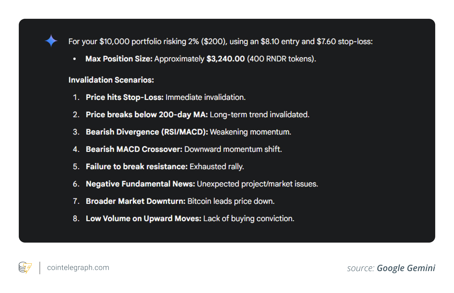 Rather than chasing setups blindly, Gemini was asked to calculate position sizing and invalidation rules for a $10,000 portfolio risking 2% on the RNDR trade. It returned a max size of $3,240, assuming a 6.2% stop-loss, and flagged eight invalidation conditions, including bearish RSI shifts, negative news and macro disruptions.