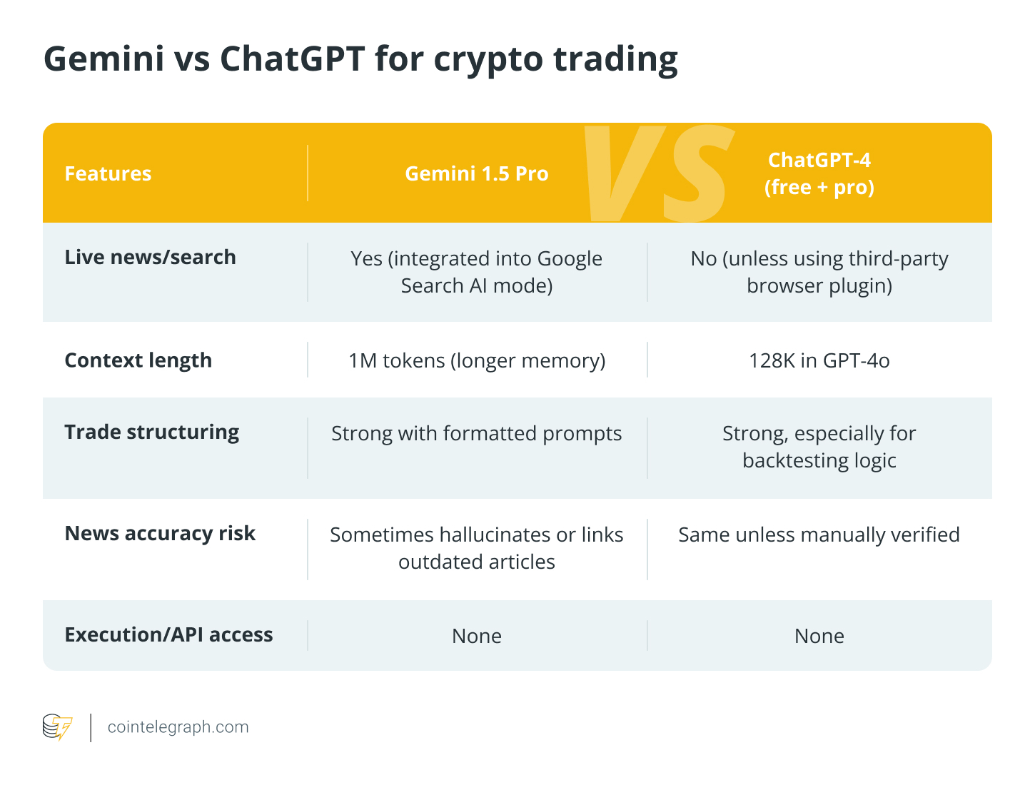 In 2025, AI tools aren’t just summarizing text; they’re being used by crypto traders to make sense of fast-moving narratives. Gemini, particularly its Pro version, stands out because it can natively access Google Search. This means traders can ask it to pull news updates, summarize catalysts or cross-check signals without relying on plugins or extensions.