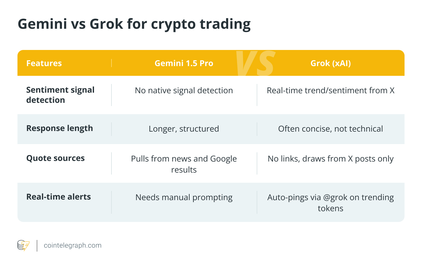 Depending upon their risk tolerance, traders could use Grok to detect token chatter, then Gemini to verify news validity and ChatGPT to structure a full trade plan.