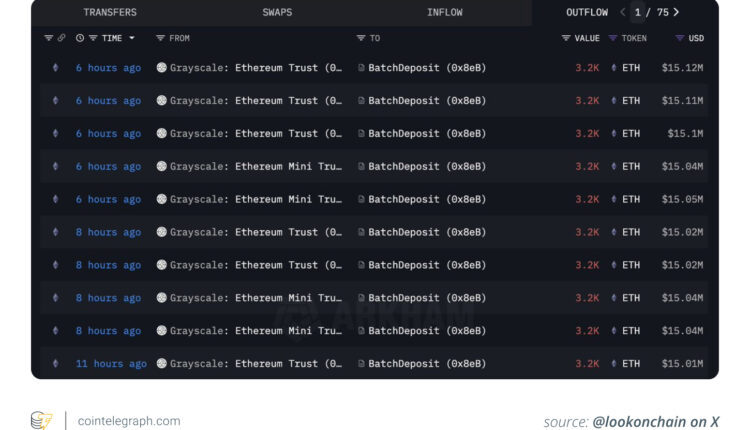 Grayscale staked 32,000 ETH (about $150 million) a day after it enabled staking for its Ether ETPs, making it the first US crypto fund issuer to offer staking-based passive income via US-listed spot products.