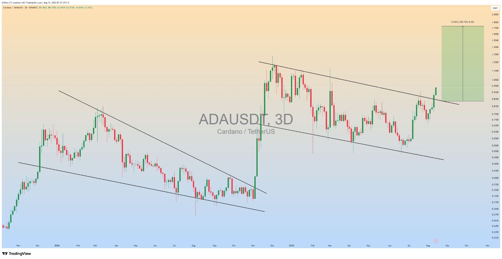 That breakout appears to be underway, with ADA facing resistance from $1, a level that has suppressed the price since December 2024.