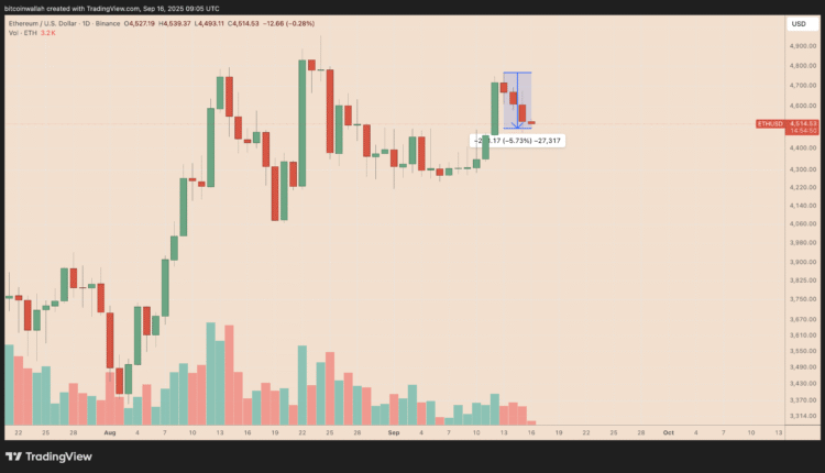 Ethereum’s native token, Ether (ETH), has fallen 5.73% from its weekend high near $4,766, retreating as traders trim risk ahead of Wednesday’s Federal Reserve interest rate decision.