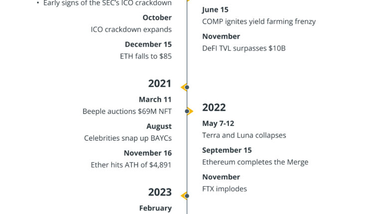 Here’s a look back into Ethereum’s first decade, featuring the ICO boom, DeFi summer and the rise and fall of non-fungible tokens (NFTs).