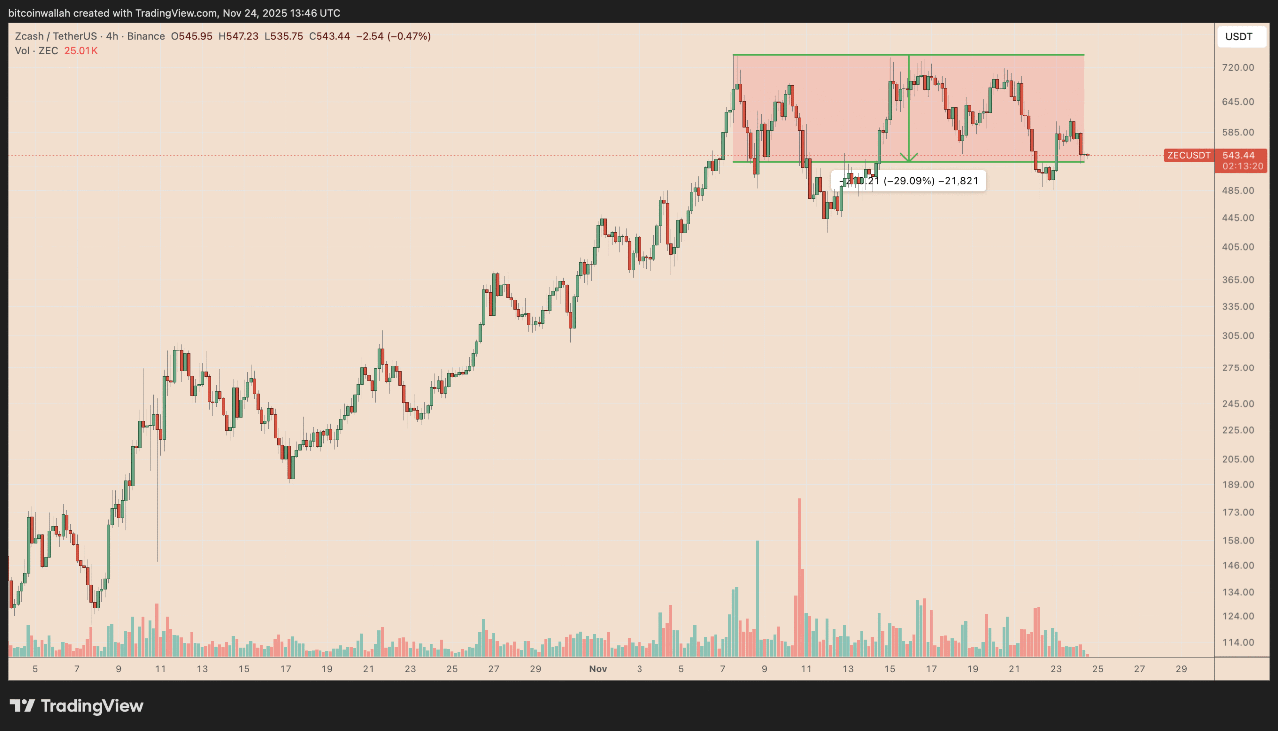 As of Monday, Zcash traded within a symmetrical triangle pattern on the four-hour chart, reflecting indecision among traders following its 1,500% price rally since late September.