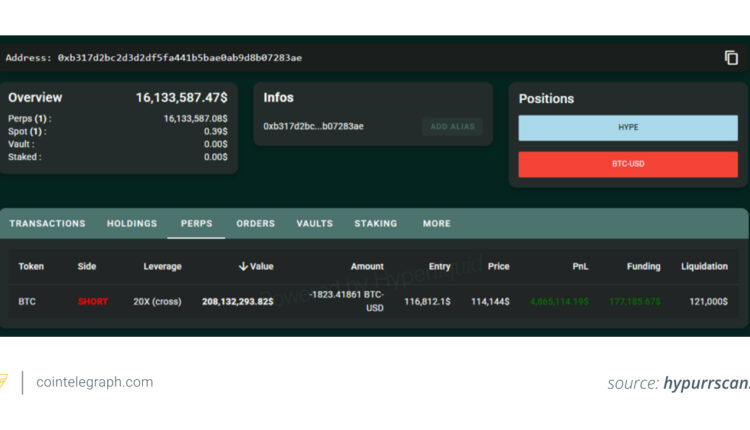 Wallet “0xb317” launches a new $163-million short against Bitcoin