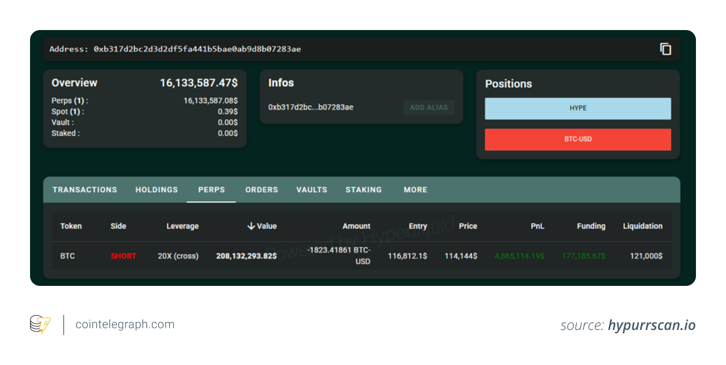 On Hyperliquid, the trader placed a $208-million cross-margin perpetual short with 20x leverage. The position was entered at around $116,800, with a liquidation level near $121,000. As Bitcoin’s price fell, the trader’s unrealized profit topped $190 million — one of the most successful onchain short trades ever recorded.