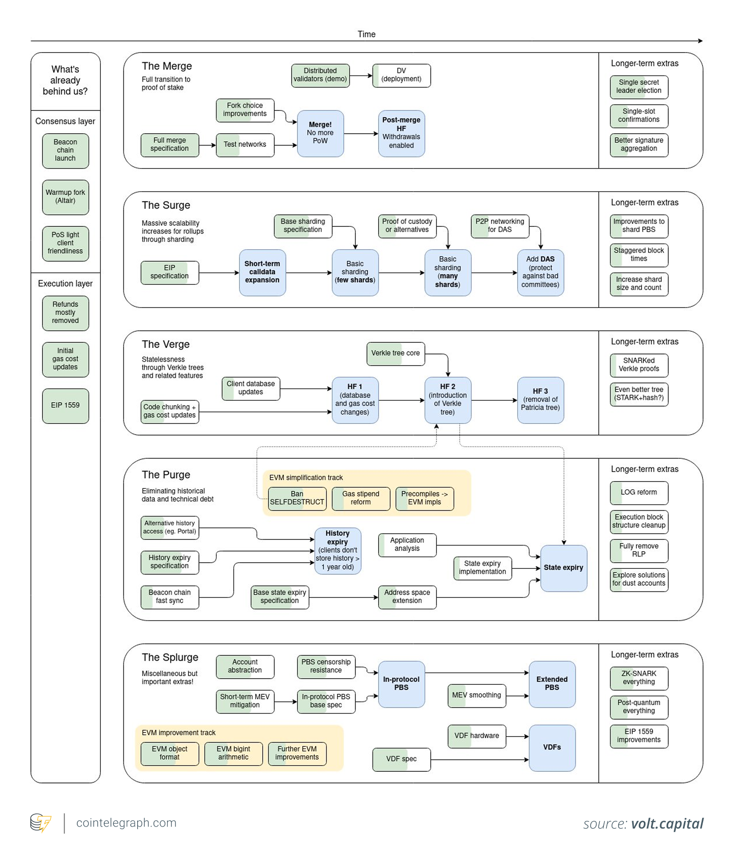 Those upgrades lined up with Vitalik Buterin’s shorthand roadmap: Merge, Surge, Verge, Purge and Splurge. The Surge is about scaling Ethereum through rollups and better data availability, while the Verge and Purge focus on lighter clients and pruning old history.