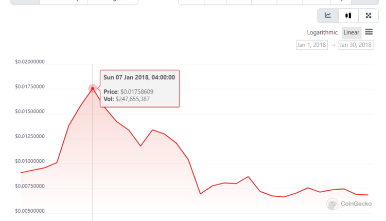 Days after DOGE hit the milestone, the cryptocurrency proceeded to pump up to $0.0175, bringing its market capitalization to $1.98 billion before falling to a $784-million market cap, when the price fell to $0.0069 back on Jan. 16, 2018.