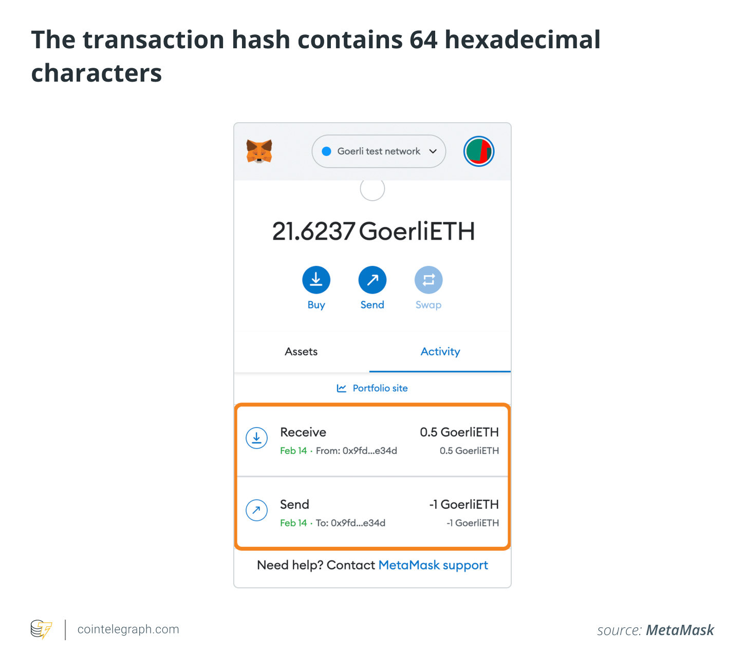 Depending on the platform, it can also be called a “hash” or “txn hash.” It usually looks like a string of random letters and numbers. On MetaMask, for example, a user can instantly see the txid upon clicking the “Activity” tab and selecting the transaction.