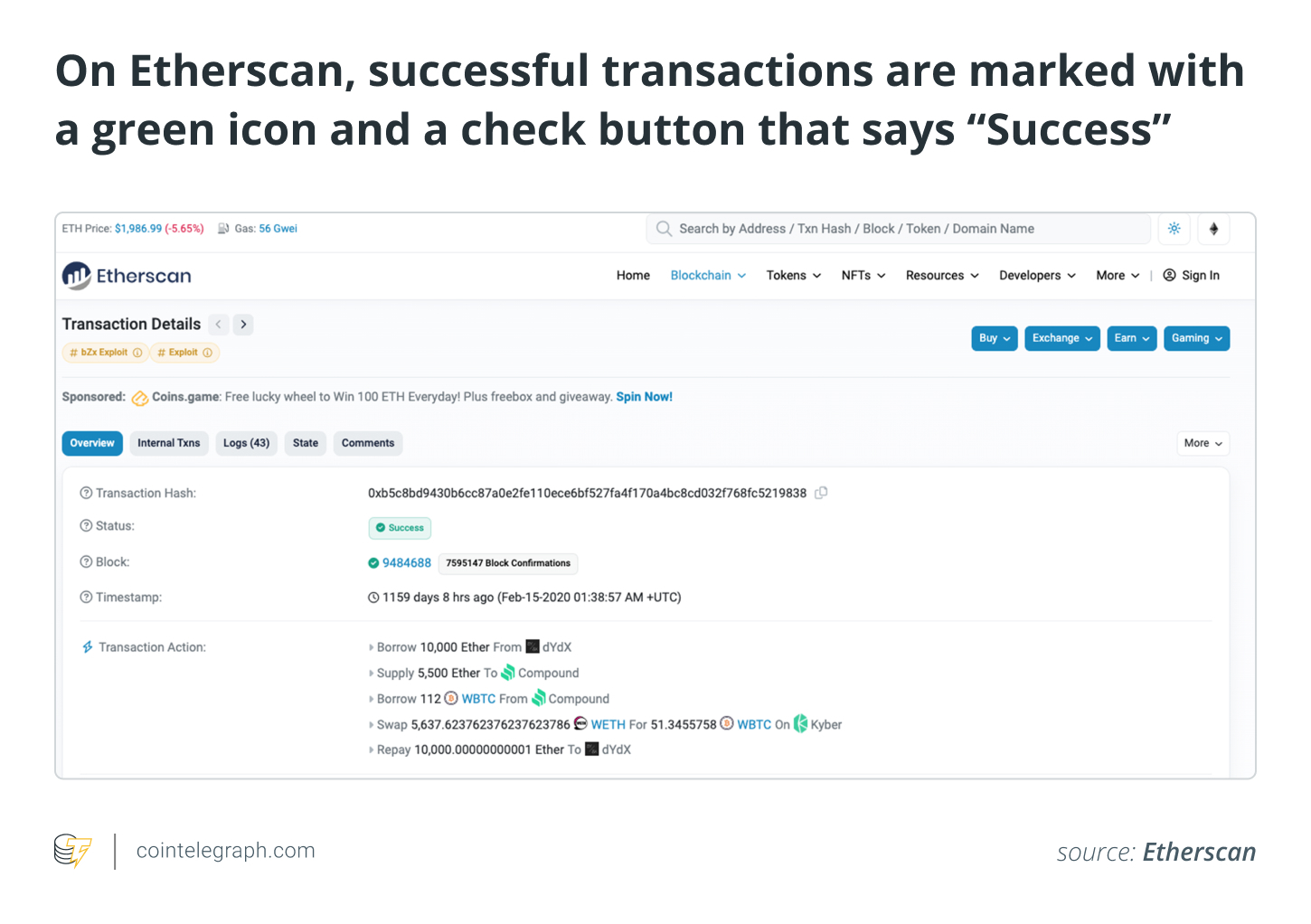 By checking a transaction’s status, traders can confirm whether their transaction has succeeded or failed and how many blocks have been created since their transaction was added to the chain.