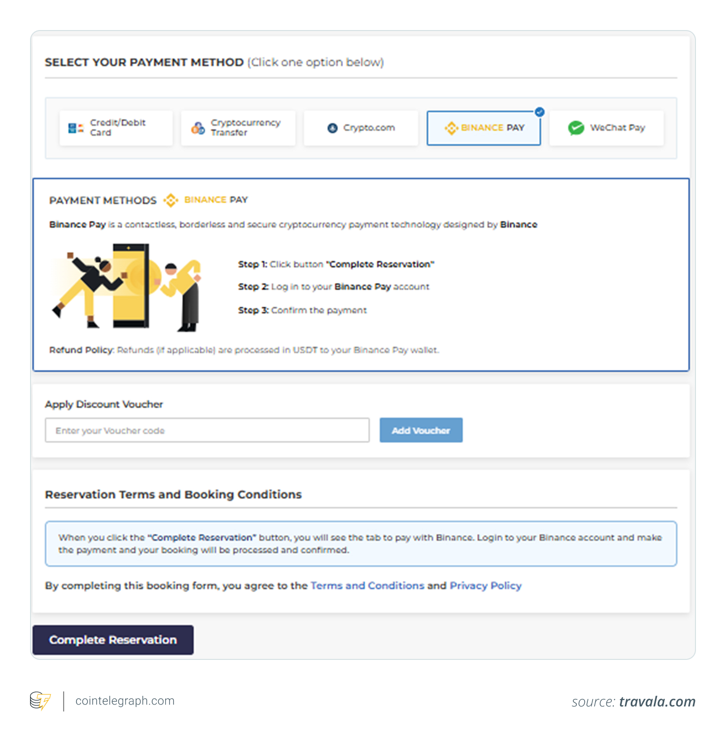 Step 4) Connect crypto wallet: Select the appropriate crypto payment tab and tap “Complete reservation.” In the case of Travala, you could tap Cryptocurrency Transfer, Crypto.com or Binance Pay and initiate the payment process.