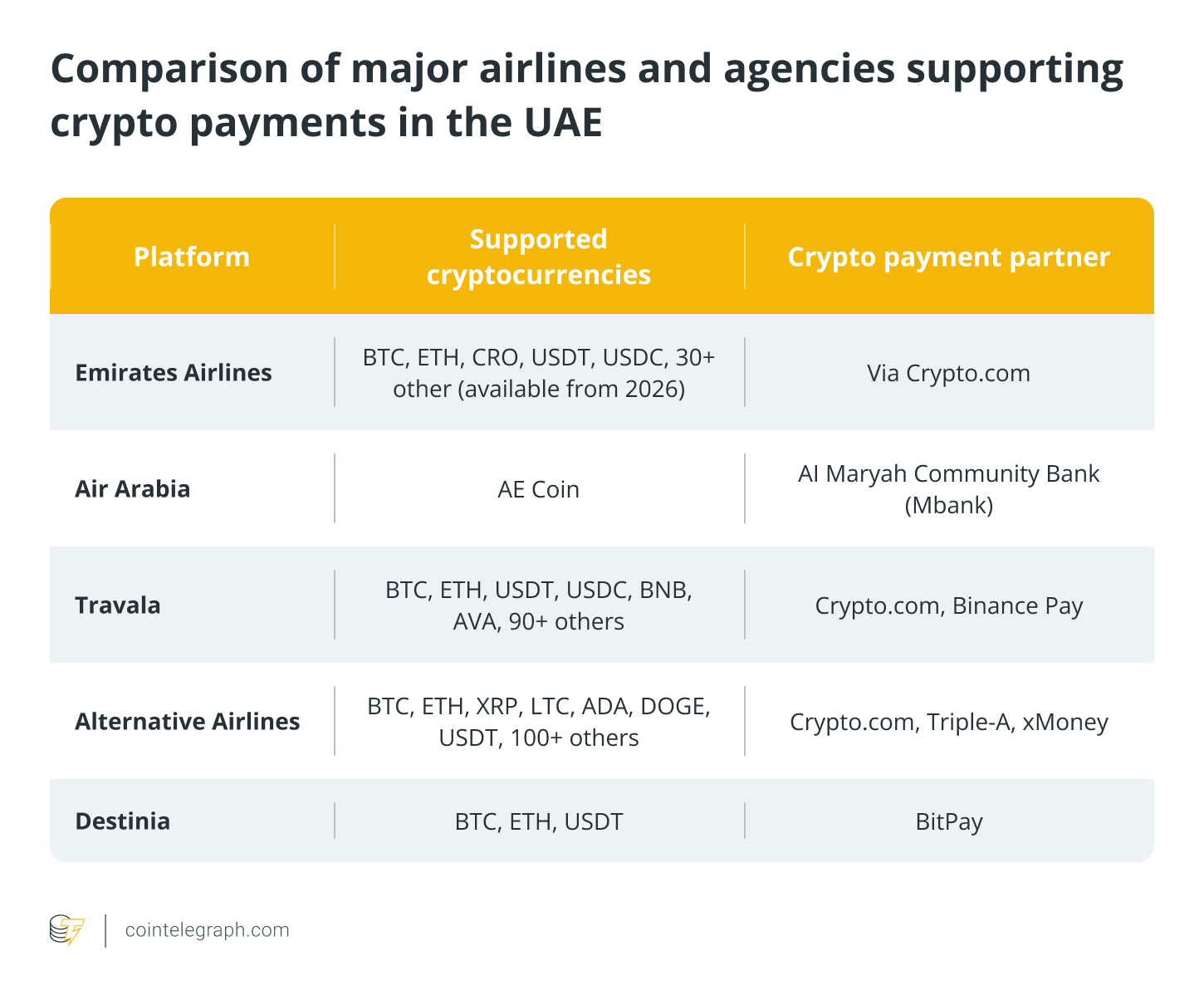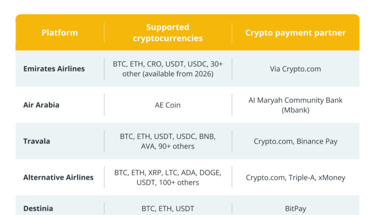Airlines and travel agencies, including Emirates, Air Arabia, Travala and Alternative Airlines, now support cryptocurrency payments for bookings, targeting tech-savvy travelers and digital nomads.