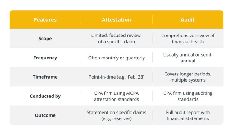 Unlike full audits, which evaluate broader financial systems and controls, attestations are narrower in scope. They confirm specific facts, like whether reserve balances match circulating supply at a single point in time.