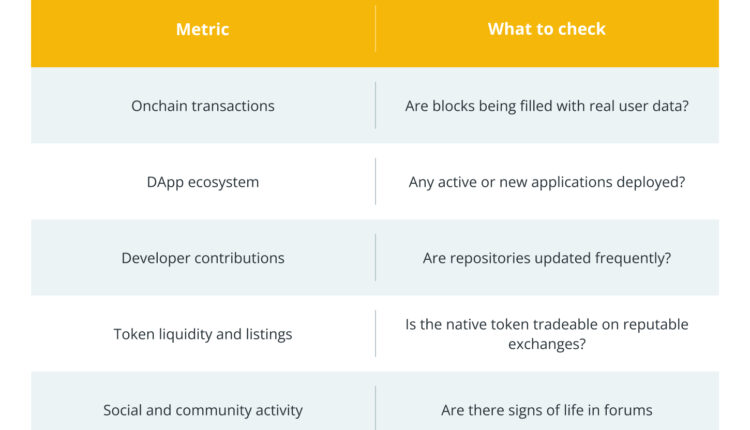 Check DApp activity: A thriving chain will have decentralized apps, DeFi protocols, NFT marketplaces and other smart contracts in use. If the ecosystem is barren, chances are it’s not attracting builders or users and is on its way to decline.