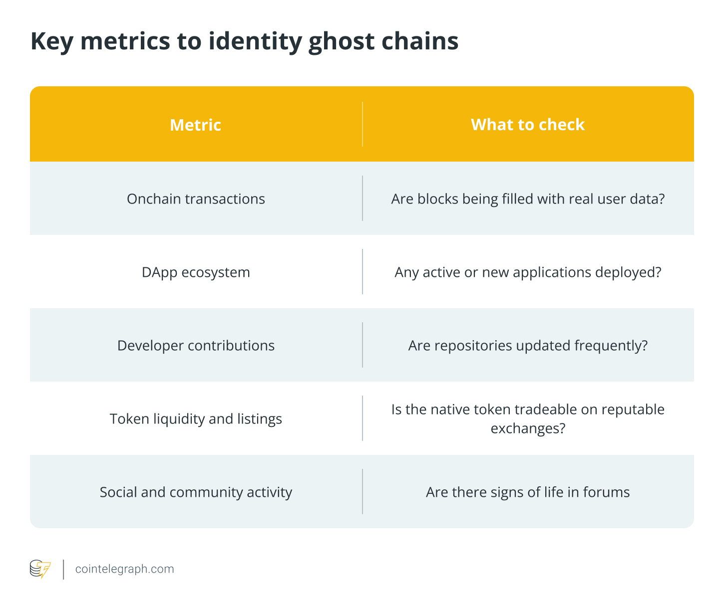 Investors and developers can avoid ghost chains by monitoring onchain activity, GitHub commits, token liquidity, and community health before committing resources.