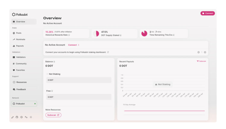 According to crypto-staking data aggregator Staking Rewards, the annual reward rate Polkadot holders may receive varies based on the wallet, the crypto-trading platform and the validators. The maximum annual reward rate that holders can earn is 14.34%. Polkadot’s staking dashboard provides on-chain data to indicate current rewards.