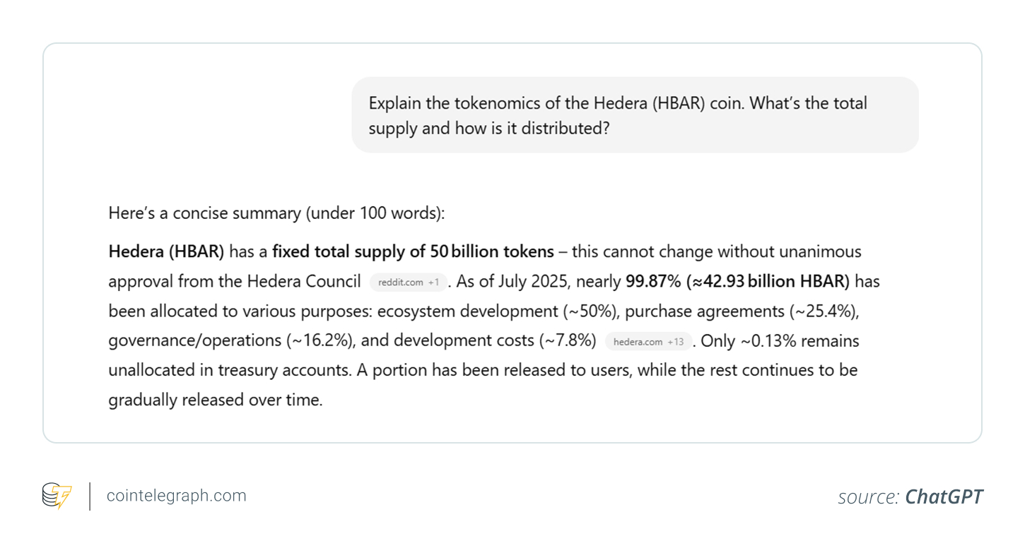“Explain the tokenomics of the Hedera (HBAR) coin. What’s the total supply and how is it distributed?”
