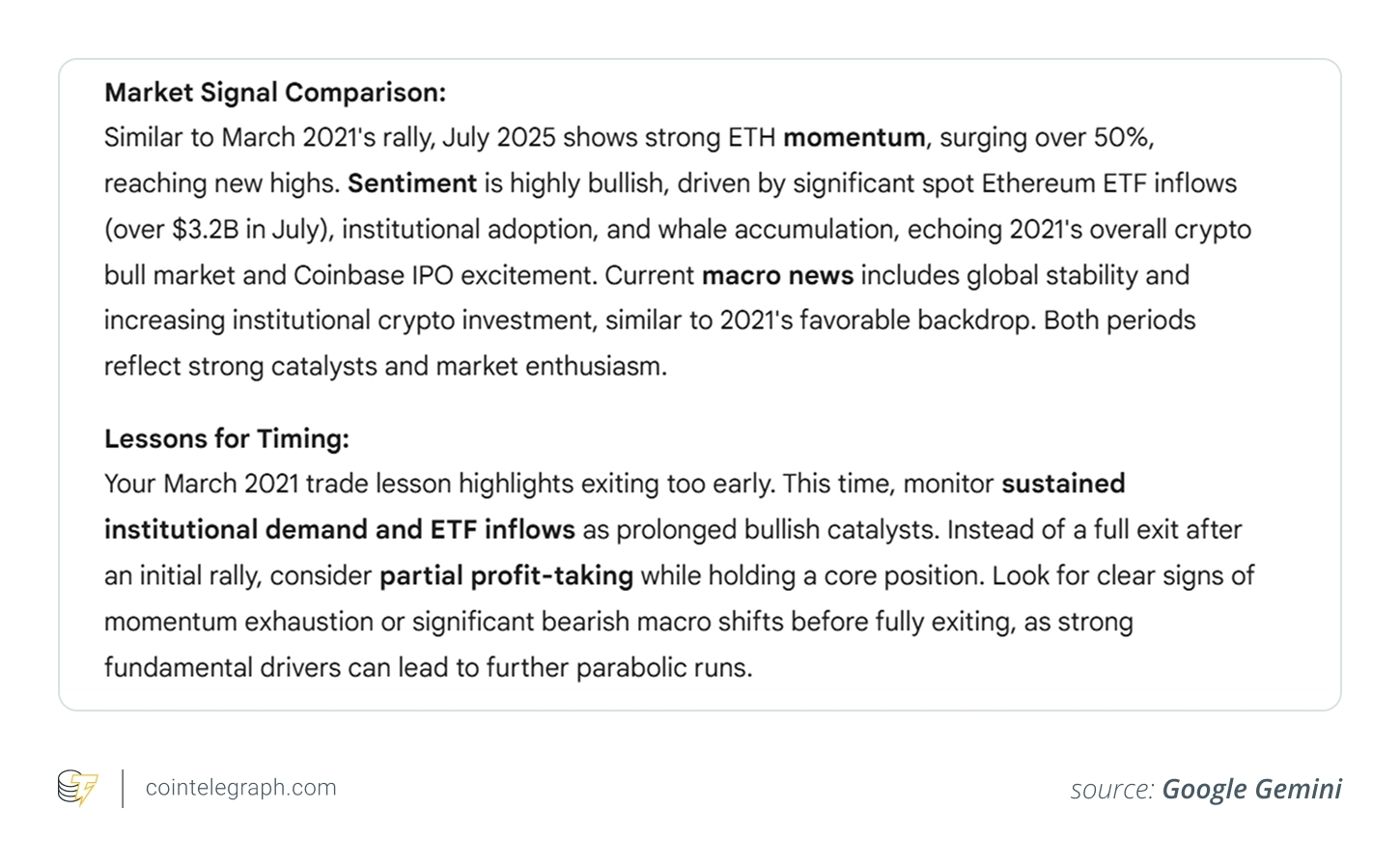 Gemini’s response below does a strong job of comparing March 2021 ETH trade with the July 2025 market environment. It identifies similar bullish drivers such as strong momentum (+50% surge), ETF inflows ($3.2 billion in July), institutional demand, and macro stability, mirroring the backdrop from 2021.