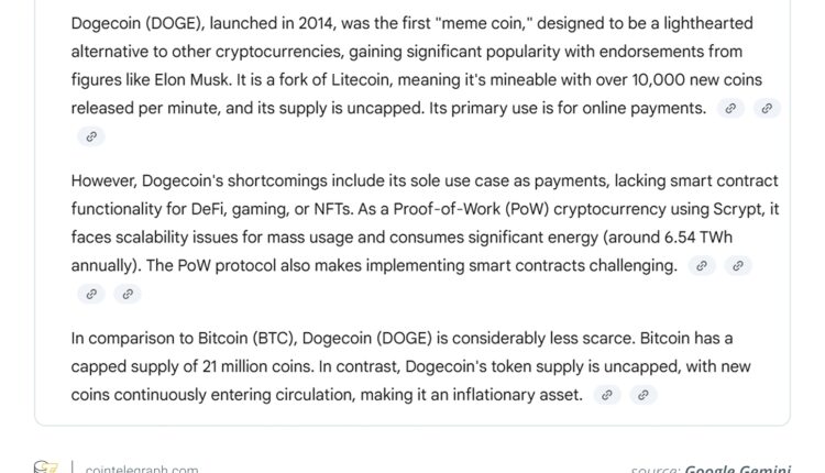 In response, Gemini describes Dogecoin as a memecoin used mainly for payments, with an uncapped supply and over 10,000 coins minted per minute. It lacks smart contract features, faces energy and scalability issues due to PoW and is inflationary compared to Bitcoin (BTC), which has a fixed supply of 21 million coins.