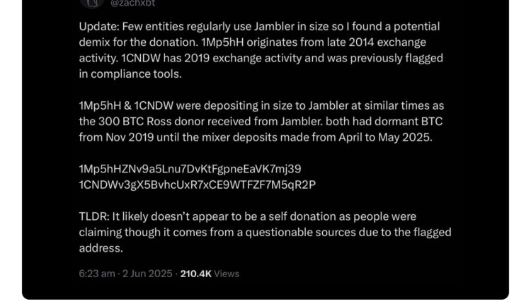 “It likely doesn’t appear to be a self-donation as people were claiming, though it comes from questionable sources due to the flagged address,” said ZachXBT in a June 2, 2025, X post.