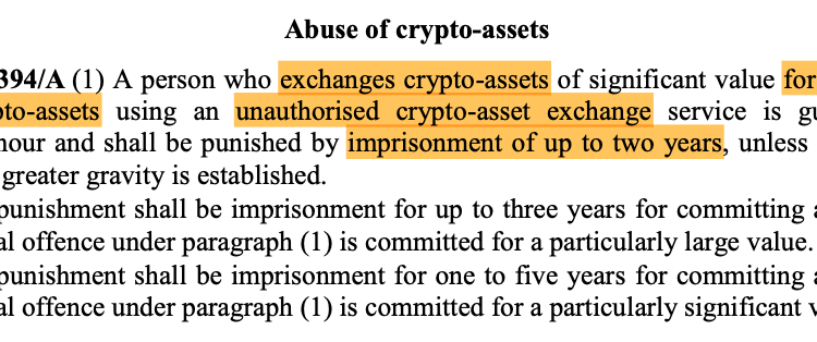 The second updated law around crypto gives up to three years in prison for those who provide unauthorized “crypto-asset exchange service activities” of up to 50 million forints ($145,950).