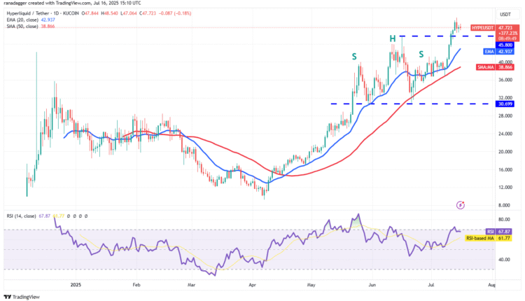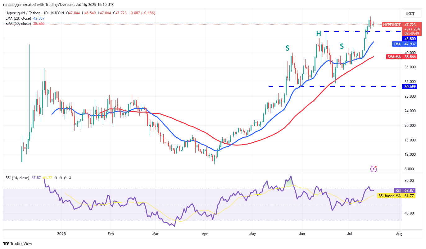 The upsloping moving averages and the relative strength index (RSI) near the overbought territory indicate buyers are in control. If the price rebounds off $45.80, it suggests the bulls have flipped the level into support. That enhances the prospects of a break above $50. The HYPE/USDT pair may then ascend to $60.