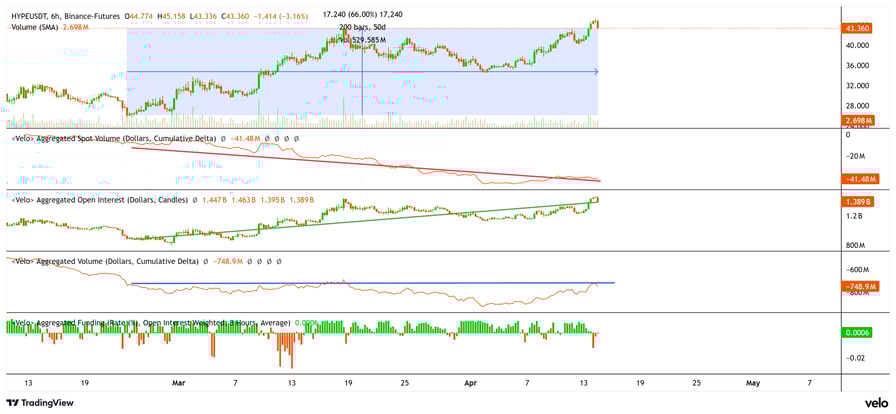 HYPE price, aggregated spot volume, futures volume, and funding rate. Source: velo.chart