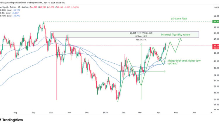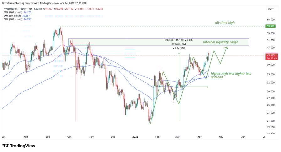 Hyperliquid’s native token HYPE (HYPE) re-tested $45 on Tuesday, marking its highest value since October 31, 2025. The rally extends a 108% rally from its yearly low at $21 on Jan. 21.