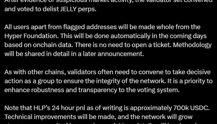 Hyperliquid is delisting perpetual futures tied to the JELLY token after identifying “evidence of suspicious market activity” involving the trading instruments, the blockchain network said.