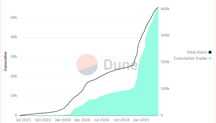The platform’s real explosion, however, came in November 2024, following the launch of its HYPE (HYPE) token. Hyperliquid’s trading volume skyrocketed, and it now boasts over 400,000 users and more than 50 billion trades processed, according to data from Dune.