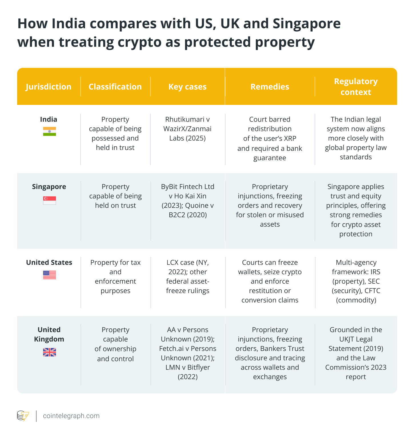 The Madras High Court’s ruling recognizes that cryptocurrencies constitute property under Indian law, offering legal protection to holders in India. With this decision, India aligns with other jurisdictions — including Singapore and the United States — that have also treated crypto assets as property in certain legal contexts.