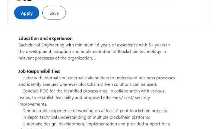 The ideal candidate will be a seasoned technologist with at least six years of experience in developing and implementing blockchain, who will be primarily tasked with identifying “avenues wherever blockchain-driven solutions can be used.”