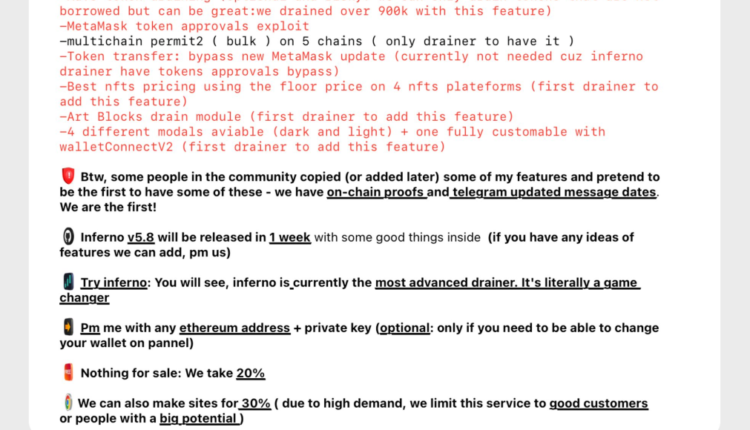 According to the report, Inferno Drainer advertised its “service” to scammers in return for 20% of profits. It even offered to build phishing sites for customers in exchange for 30%, but only for “good customers or people with big potential.”