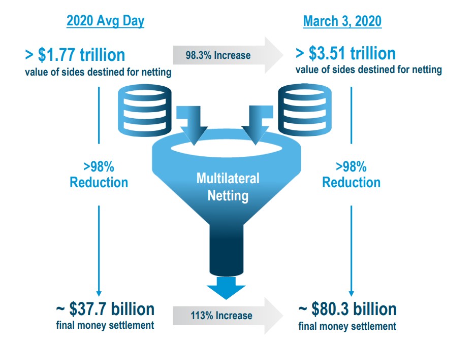 Multilateral netting reduces trillions in trades to tens of billions in settlement. Source: Depository Trust & Clearing Corporation