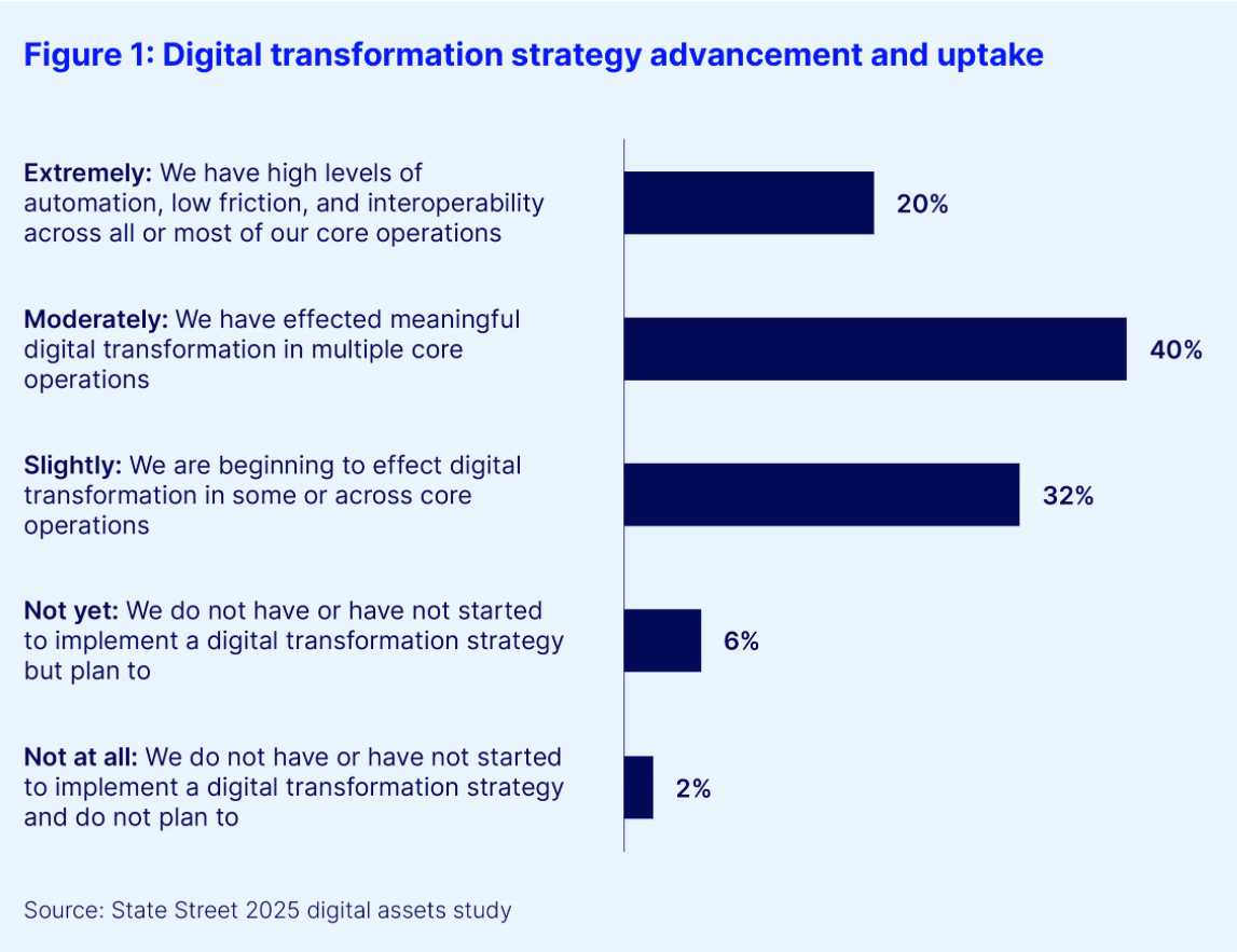 The study also shows that distributed ledger technology (DLT) and artificial intelligence are now critical to institutions’ digital transformation strategies.